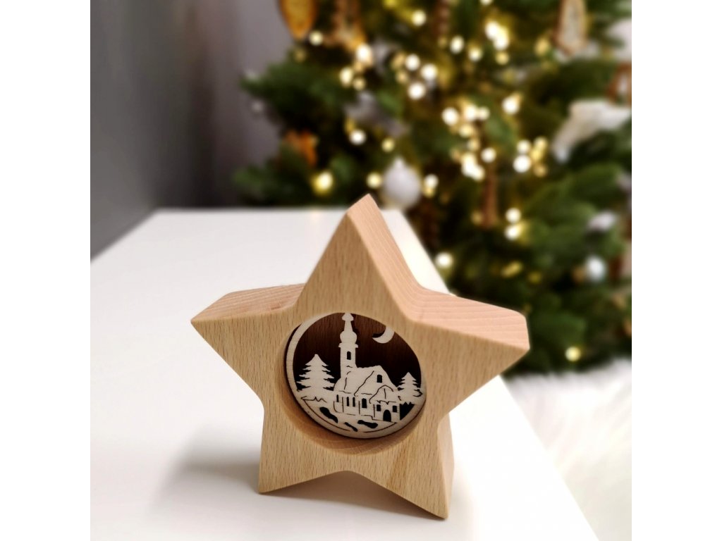 Die Holzdekoration in Form eines Sterns mit einem Kircheneinsatz ist aus massivem Buchenholz und der Einsatz aus Pappelsperrholz gefertigt. Die Abmessungen sind 10 x 10 x 3 cm. Das Holz ist an der Oberfläche mit Naturöl behandelt.Zusätzliche Parameter