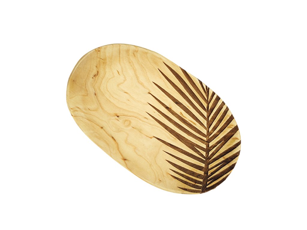 Stylische Servierplatte aus massivem Erlenholz mit einer Gravur im Blattmotiv. Die Platte ist eine geschmackvolle Ergänzung jeder Küche und eignet sich auch hervorragend als schönes Geschenk. Das Holz ist an der Oberfläche mit natürlichem Öl behandelt. Die Maße betragen 22x14,5 cm.Zusätzliche Parameter