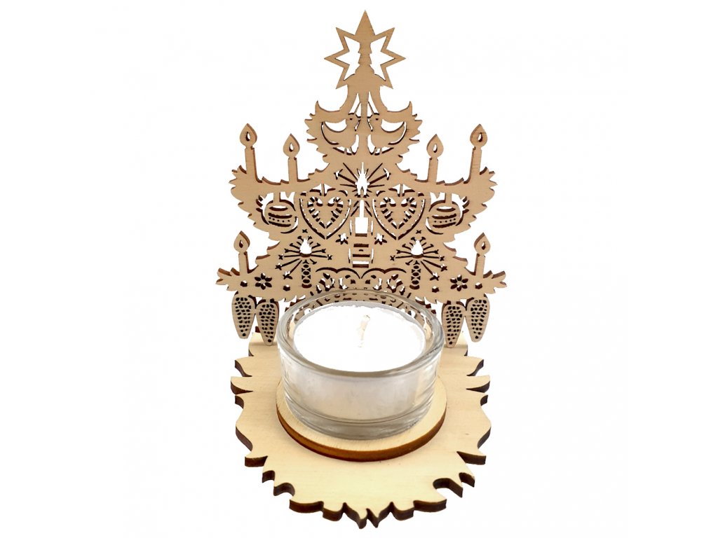 Der natürliche Kerzenhalter aus Holz in Form eines Weihnachtsbaums ist aus Pappelsperrholz gefertigt. Die Abmessungen betragen 11 cm. Die Dekoration besteht aus zwei Teilen, die in einem Beutel verpackt sind, und die Montage ist sehr einfach. Wir empfehlen, einen Glasbecher für ein Teelicht zu bestellen - Code 71174.Zusätzliche Parameter