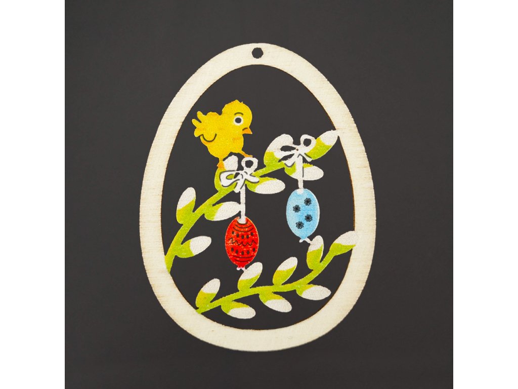 Dřevěná dekorace barevné vajíčko s motivem kuřátka, velikost 6 cm, český výrobek