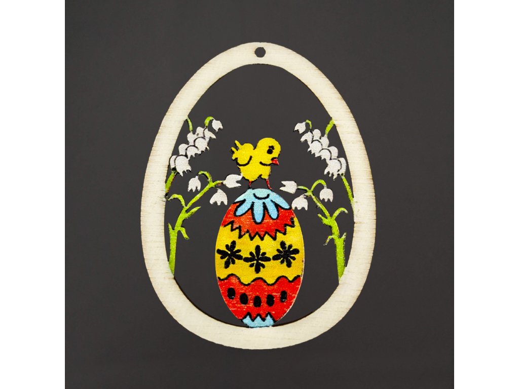 Dřevěná dekorace barevné vajíčko s motivem kuřátka, velikost 6 cm, český výrobek