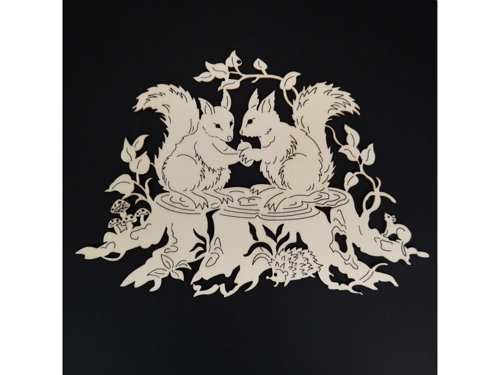 Dřevěná závěsná vyřezávaná ozdoba ve tvaru veverek na pařezu je vyrobená z překližky topolu. Rozměr dekorace je 18 cm.Doplňkové parametry