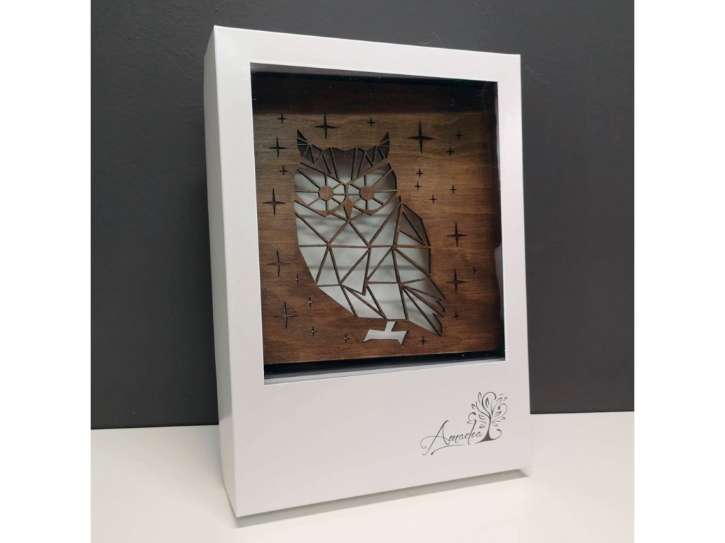 Wooden decorative lamp with owl motif is made of beech wood and finished with brown decorative wax. Dimensions 20 x 20 x 3,8 cm. The high quality LED lighting is powered by the included 12V power supply with a switch on the cable. The lamp is packed in a white gift box with a transparent lid.