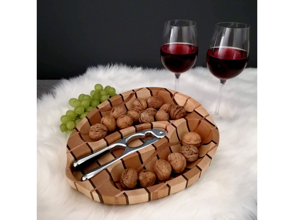 Dřevěná miska ve tvaru ořechu s louskáčkem je vyrobená z masivního dřeva buku a amerikého ořechu, rozměr je 28 x 23 x 4,50 cm, miska je na povrchu ošetřena olejem.