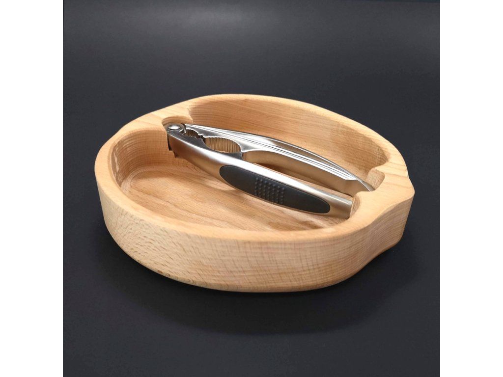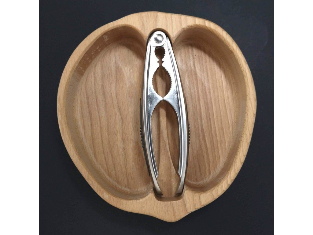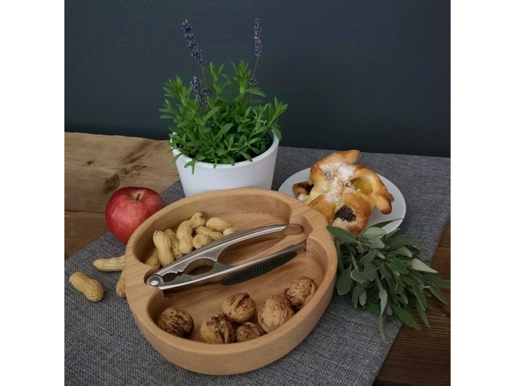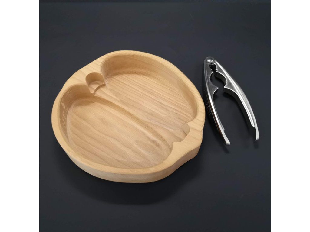 Skládaná dřevěná miska ve tvaru ořechu s louskáčkem z masivního dřeva (3 druhy). Praktická miska na ořechy i stylové servírování, 28×23×4,5 cm.