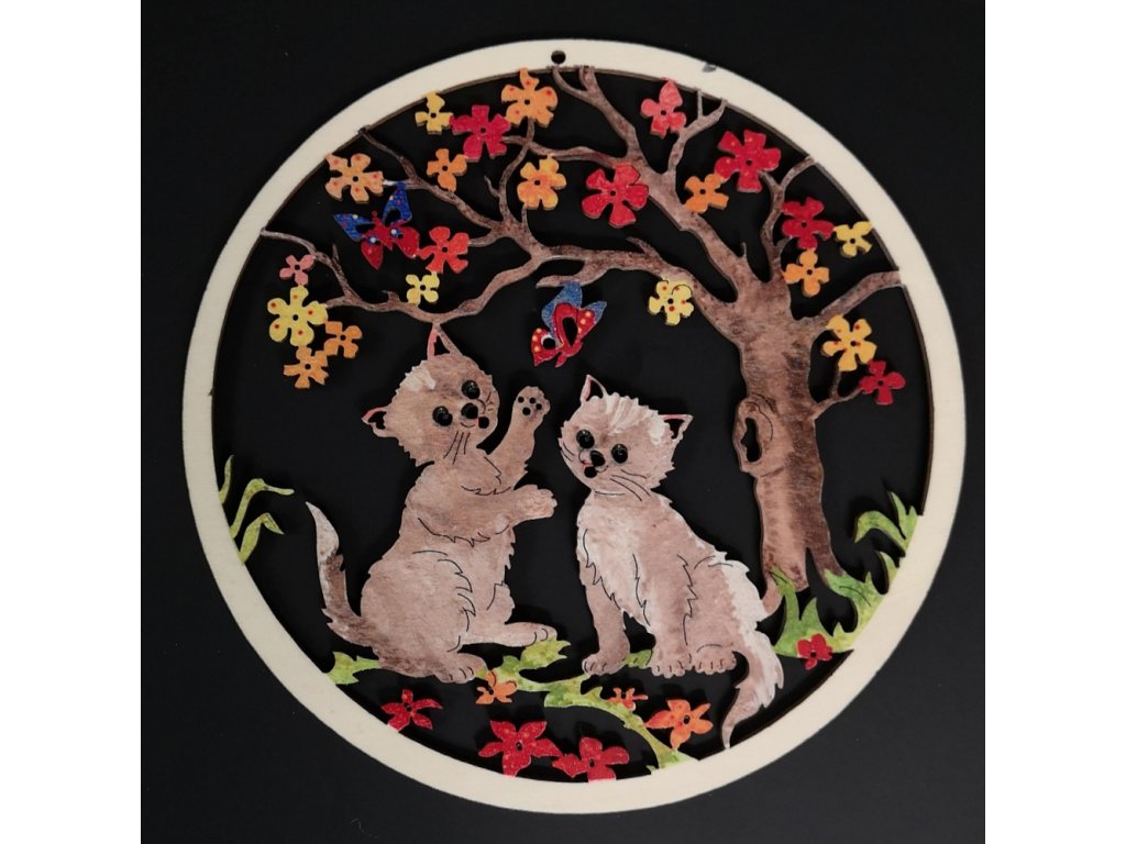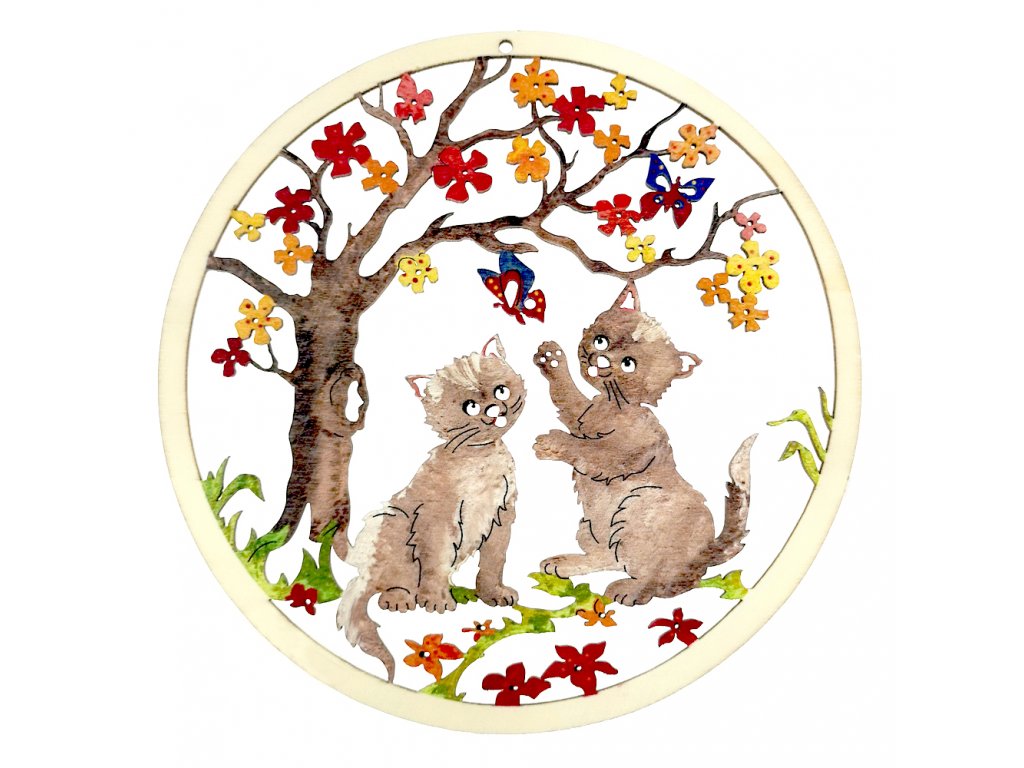 Dřevěná závěsná vyřezávaná ozdoba kolečko s kočičkami je vyrobená z překližky topolu a barevně vymalovaná. Rozměr dekorace je 19 cm.