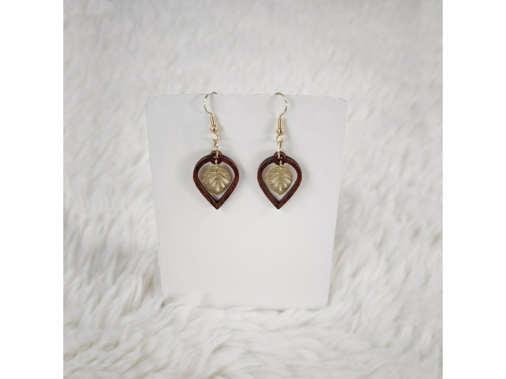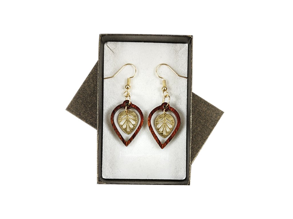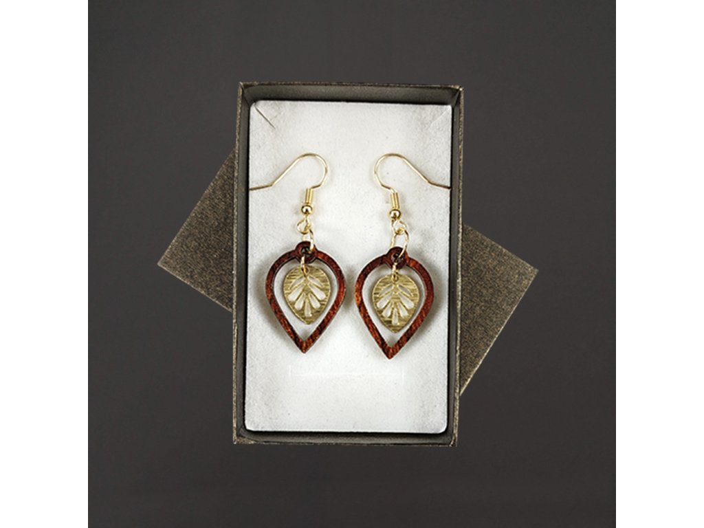 Dřevěné náušnice z topolového dřeva a mosazi ve zlaté barvě. Náušnice jsou výrazné, elegantní a zároveň vkusné, hezky oživí každodenní či večerní outfit. Jejich nošení je maximálně pohodlné. Jedná se o bižuterii a náušnice jsou dodávány na kartónku, kde jsou upevněny pomocí silikonové zarážky. Rozměr je 2,6x1,8 cm. Český výrobek.