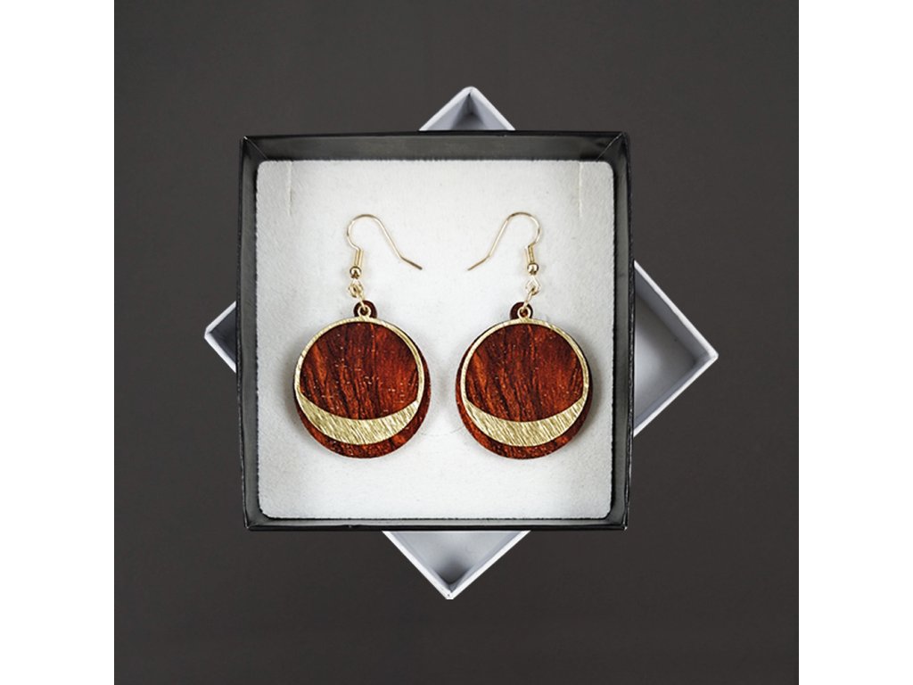 Dřevěné náušnice z topolového dřeva a mosazi ve zlaté barvě. Náušnice jsou výrazné, elegantní a zároveň vkusné, hezky oživí každodenní či večerní outfit. Jejich nošení je maximálně pohodlné. Jedná se o bižuterii a náušnice jsou dodávány na kartónku, kde jsou upevněny pomocí silikonové zarážky. Rozměr je 3,5x3 cm. Český výrobek.