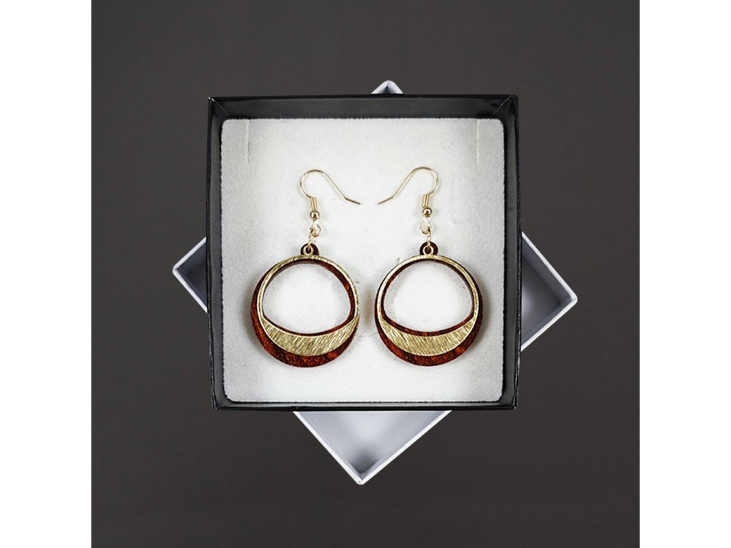 Dřevěné náušnice z topolového dřeva a mosazi ve zlaté barvě. Náušnice jsou výrazné, elegantní a zároveň vkusné, hezky oživí každodenní či večerní outfit. Jejich nošení je maximálně pohodlné. Jedná se o bižuterii a náušnice jsou dodávány na kartónku, kde jsou upevněny pomocí silikonové zarážky. Rozměr je 3,5x3 cm. Český výrobek.