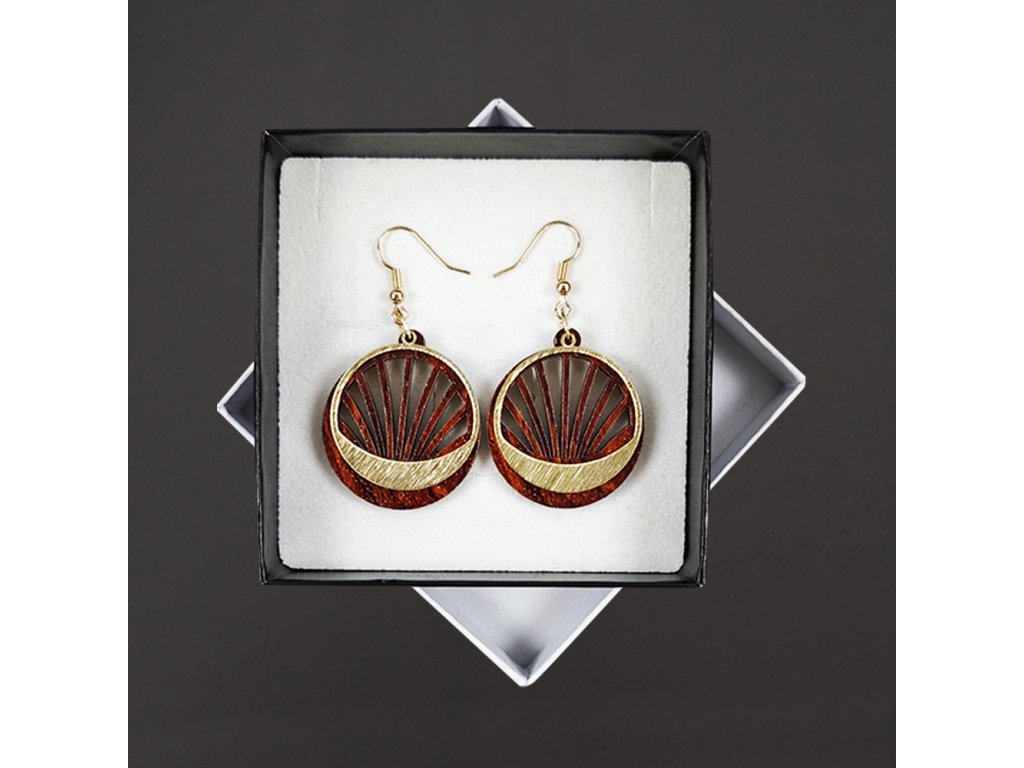 Dřevěné náušnice z topolového dřeva a mosazi ve zlaté barvě. Náušnice jsou výrazné, elegantní a zároveň vkusné, hezky oživí každodenní či večerní outfit. Jejich nošení je maximálně pohodlné. Jedná se o bižuterii a náušnice jsou dodávány na kartónku, kde jsou upevněny pomocí silikonové zarážky. Rozměr je 3,5x3 cm. Český výrobek.
