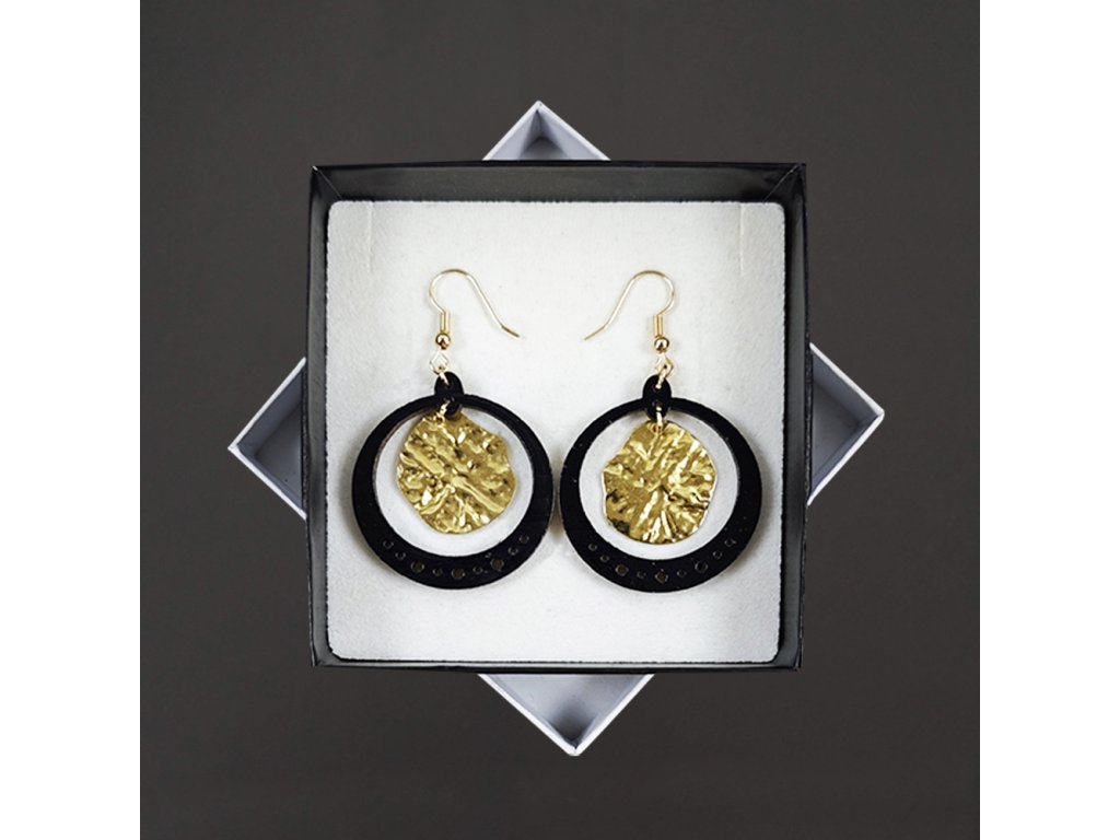 Dřevěné náušnice z topolového dřeva a mosazi ve zlaté barvě. Náušnice jsou výrazné, elegantní a zároveň vkusné, hezky oživí každodenní či večerní outfit. Jejich nošení je maximálně pohodlné. Jedná se o bižuterii a náušnice jsou dodávány na kartónku, kde jsou upevněny pomocí silikonové zarážky. Rozměr je 3,7x3,5 cm. Český výrobek.
