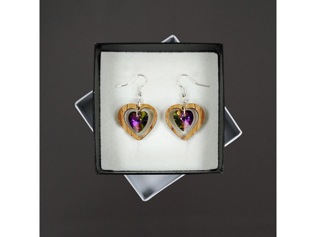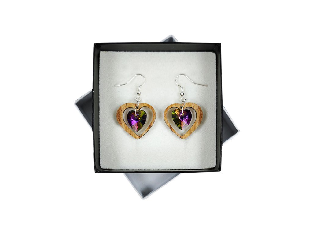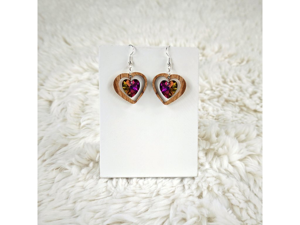 Dřevěné náušnice se skleněným broušeným kamínkem, 3,6 cm, český výrobek Náušnice jsou dodávány na kartónku, kde jsou upevněny pomocí silikonové zarážky.