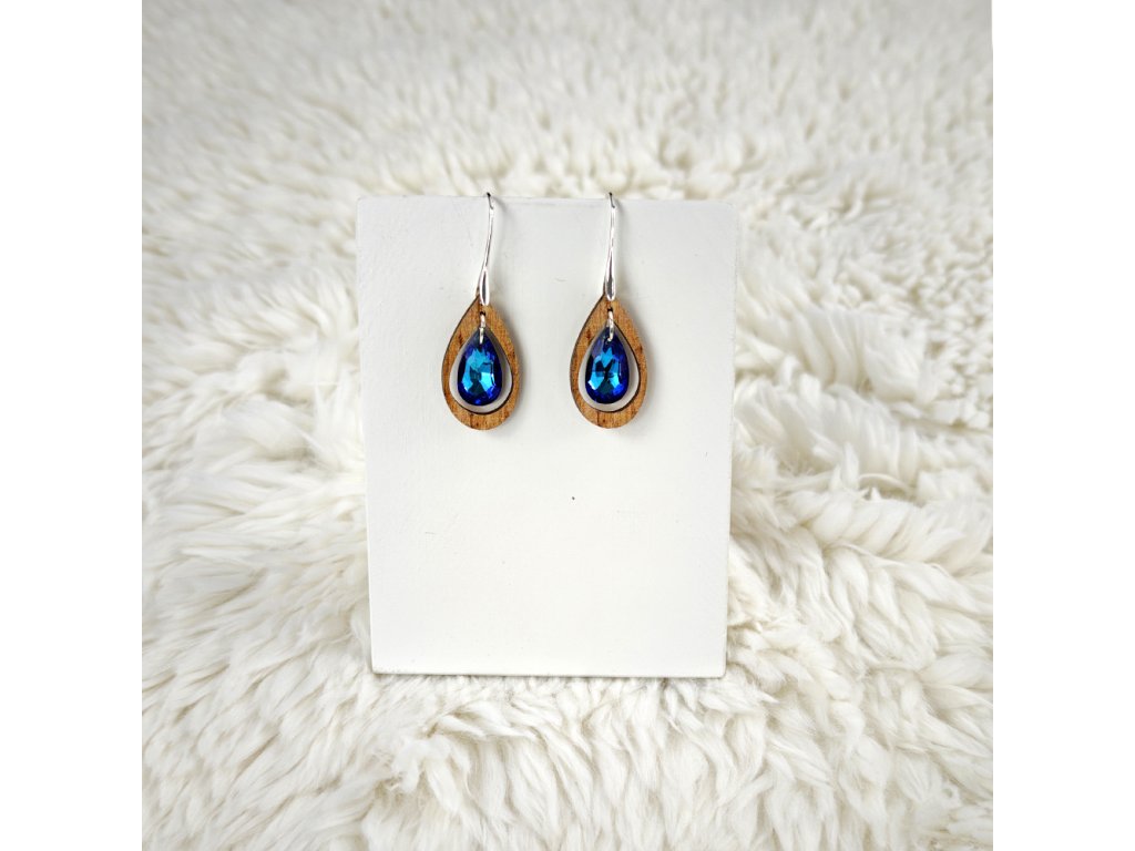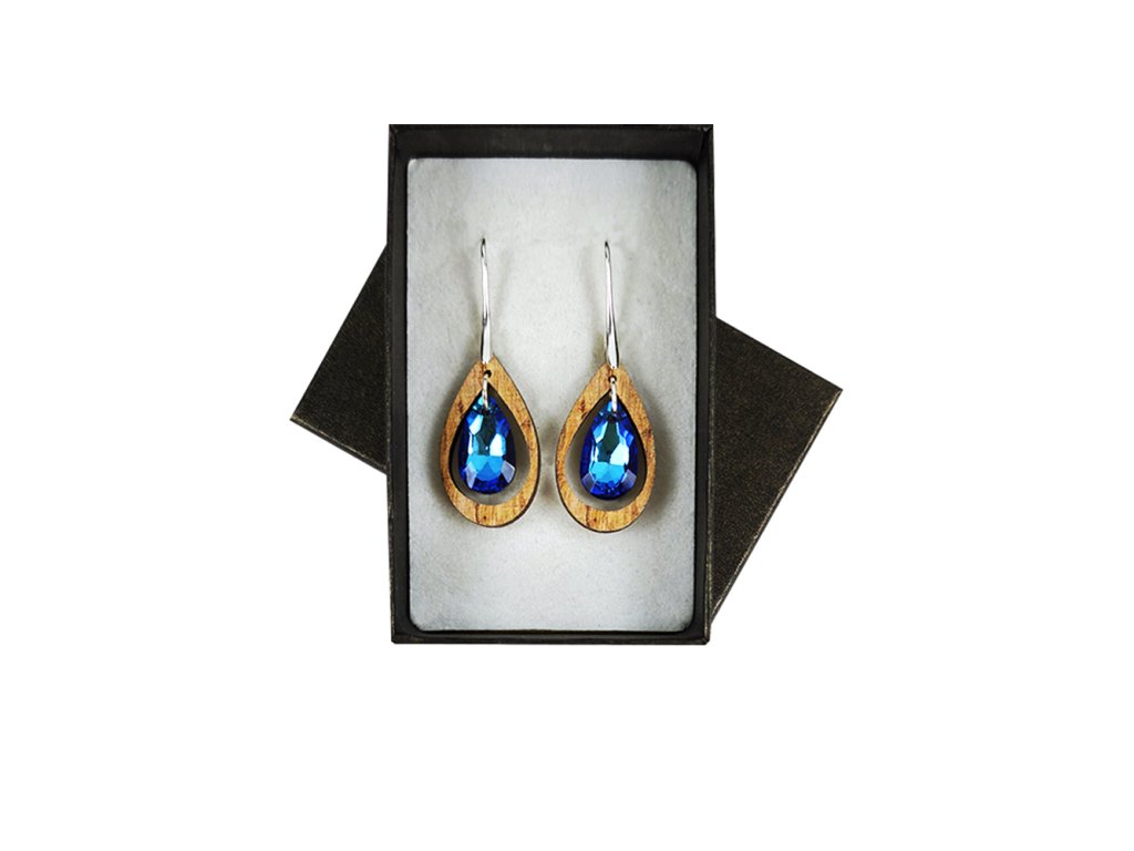 Dřevěné náušnice z topolového dřeva doplněné skleněným broušeným kamínkem. Náušnice jsou výrazné, elegantní a zároveň vkusné, hezky oživí každodenní či večerní outfit. Jejich nošení je maximálně pohodlné. Jedná se o bižuterii a náušnice jsou dodávány na kartónku, kde jsou upevněny pomocí silikonové zarážky. Rozměr je 2,9x1,6 cm. Český výrobek.