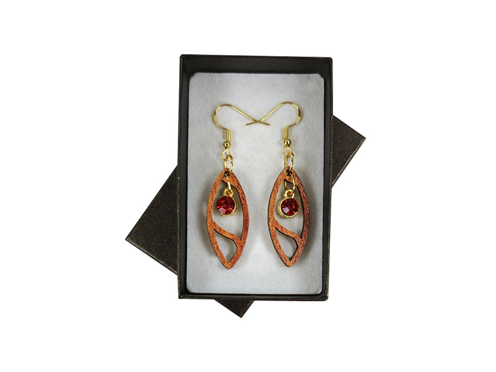 Dřevěné náušnice se skleněným broušeným kamínkem, 3,3 cm, český výrobek Náušnice jsou dodávány na kartónku, kde jsou upevněny pomocí silikonové zarážky.