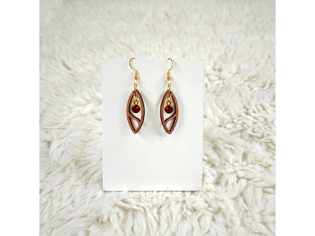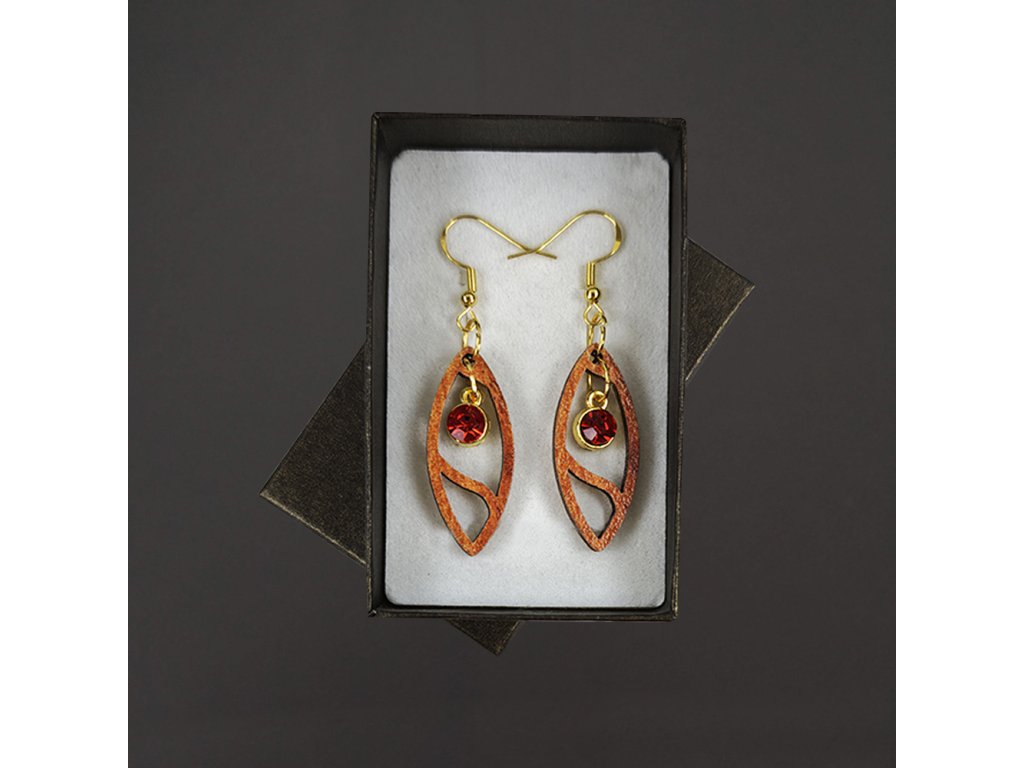 Dřevěné náušnice z topolového dřeva doplněné skleněným broušeným kamínkem. Náušnice jsou výrazné, elegantní a zároveň vkusné, hezky oživí každodenní či večerní outfit. Jejich nošení je maximálně pohodlné. Jedná se o bižuterii a náušnice jsou dodávány na kartónku, kde jsou upevněny pomocí silikonové zarážky. Rozměr je 3,4x1,4 cm. Český výrobek.