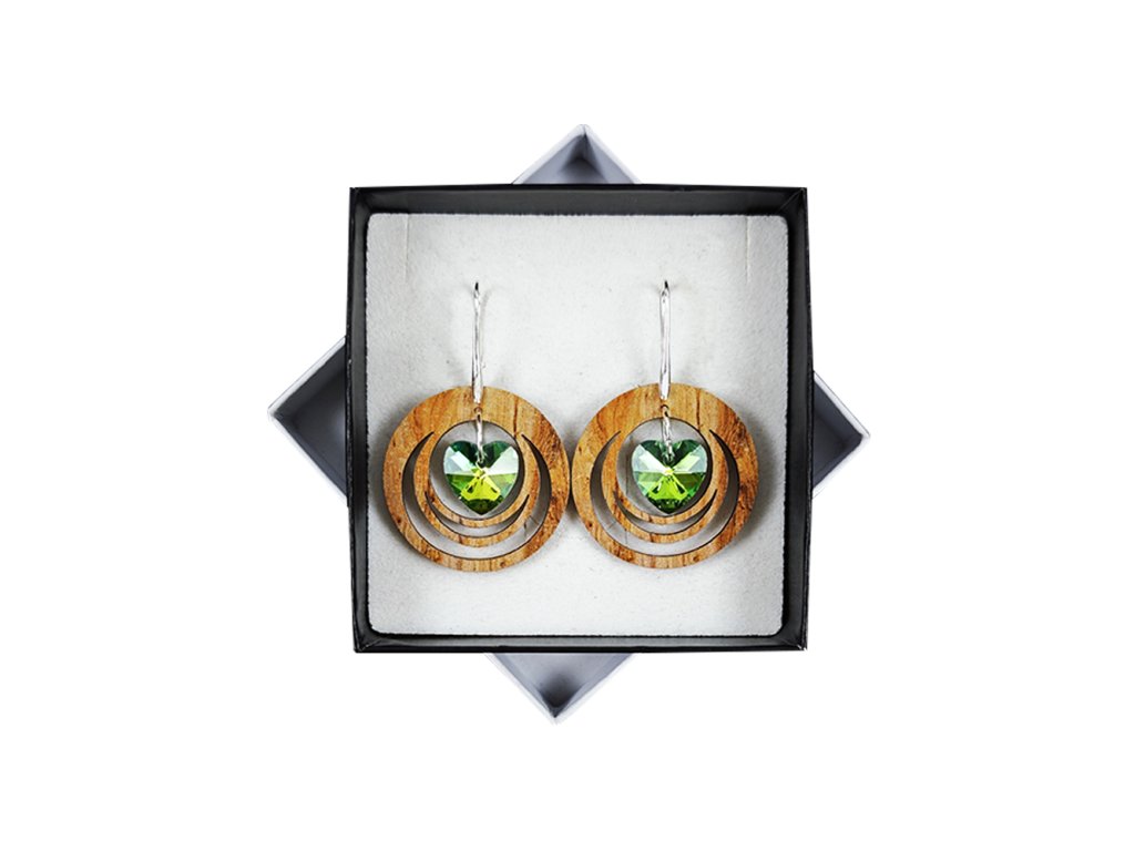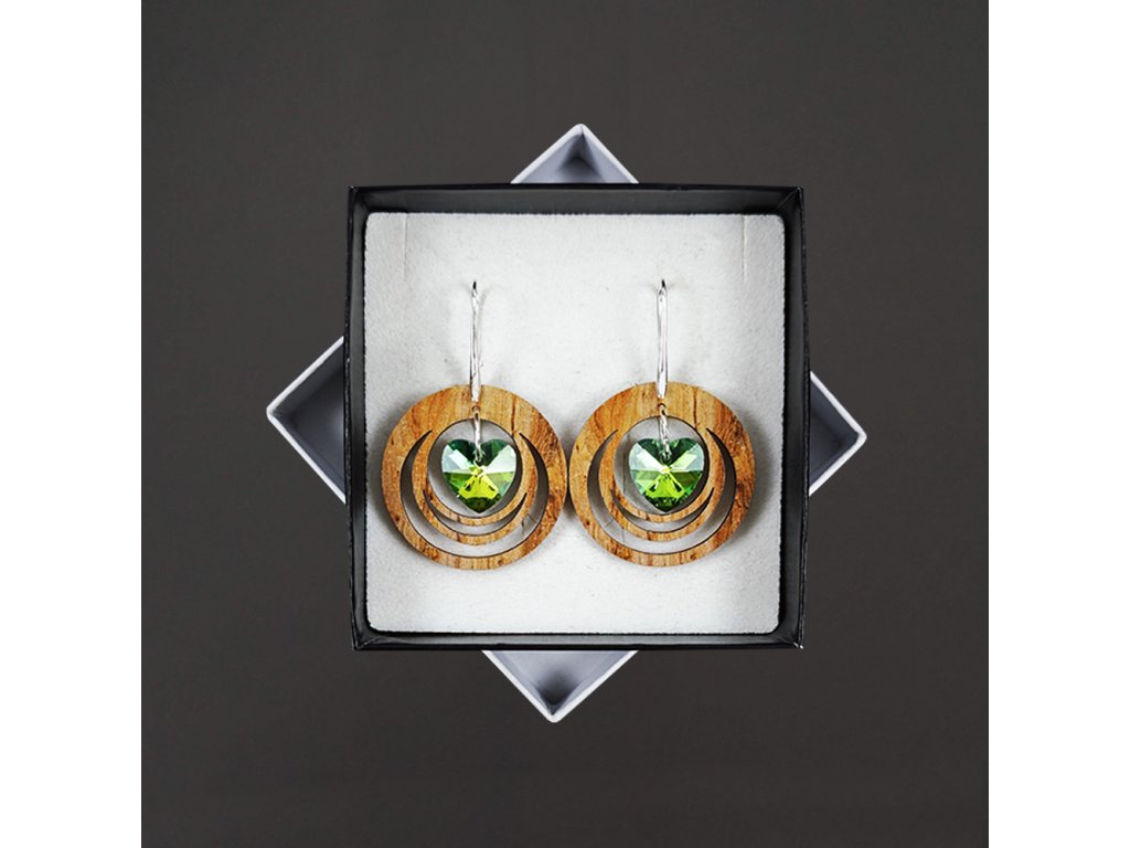 Dřevěné náušnice z topolového dřeva doplněné skleněným broušeným kamínkem. Náušnice jsou výrazné, elegantní a zároveň vkusné, hezky oživí každodenní či večerní outfit. Jejich nošení je maximálně pohodlné. Jedná se o bižuterii a náušnice jsou dodávány na kartónku, kde jsou upevněny pomocí silikonové zarážky. Rozměr je 3,5x3,5 cm. Český výrobek.