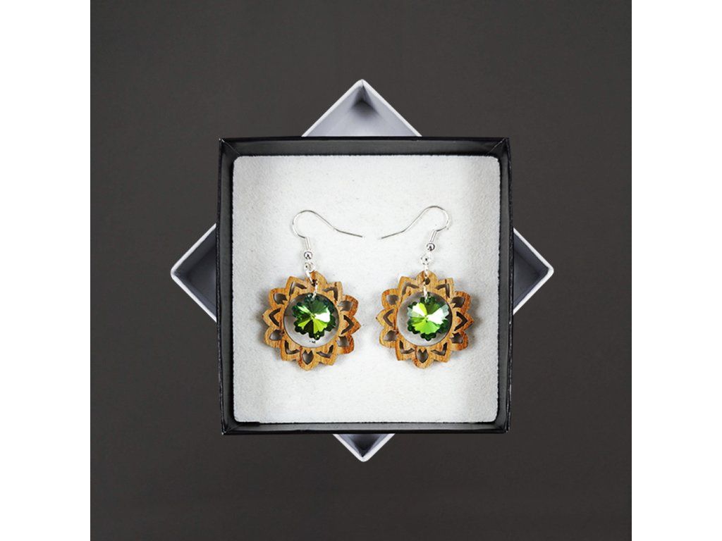 Dřevěné náušnice z topolového dřeva doplněné skleněným broušeným kamínkem. Náušnice jsou výrazné, elegantní a zároveň vkusné, hezky oživí každodenní či večerní outfit. Jejich nošení je maximálně pohodlné. Jedná se o bižuterii a náušnice jsou dodávány na kartónku, kde jsou upevněny pomocí silikonové zarážky. Rozměr je 3x3 cm. Český výrobek.
