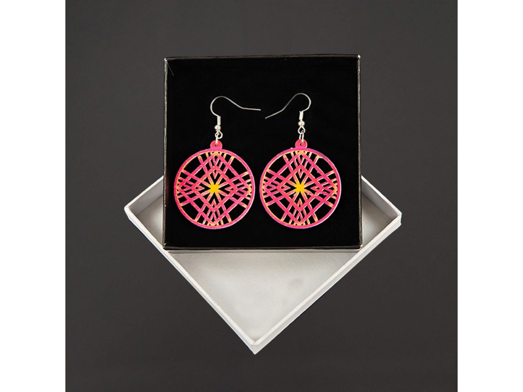 Dřevěné náušnice z topolového dřeva a barevně potištěné. Náušnice jsou výrazné, elegantní a zároveň vkusné, hezky oživí každodenní či večerní outfit. Jejich nošení je maximálně pohodlné. Jedná se o bižuterii a náušnice jsou dodávány na kartónku, kde jsou upevněny pomocí silikonové zarážky. Rozměr je 4x3,6 cm. Český výrobek.
