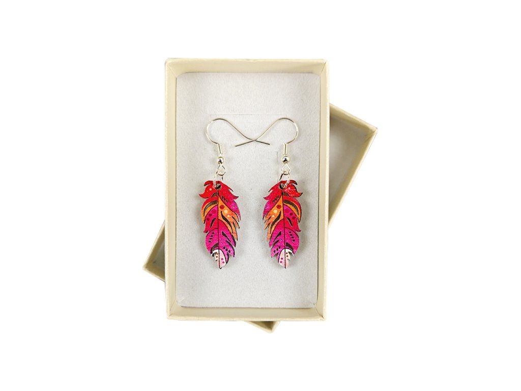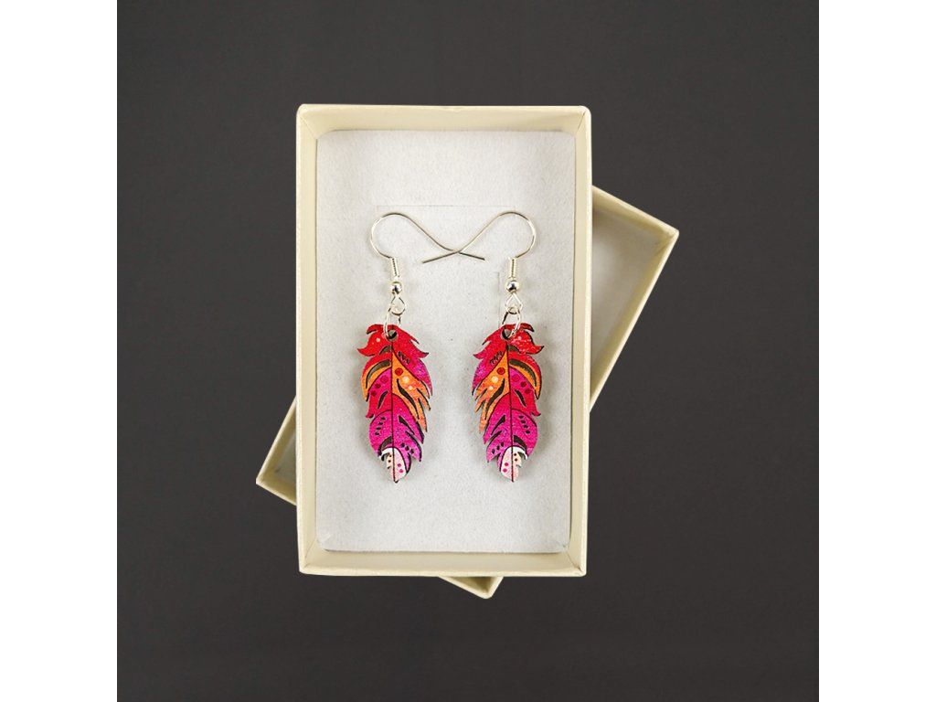 Dřevěné náušnice pírko z topolového dřeva a barevně potištěné. Náušnice jsou výrazné, elegantní a zároveň vkusné, hezky oživí každodenní či večerní outfit. Jejich nošení je maximálně pohodlné. Jedná se o bižuterii a náušnice jsou dodávány na kartónku, kde jsou upevněny pomocí silikonové zarážky. Rozměr je 3x1,4 cm. Český výrobek.