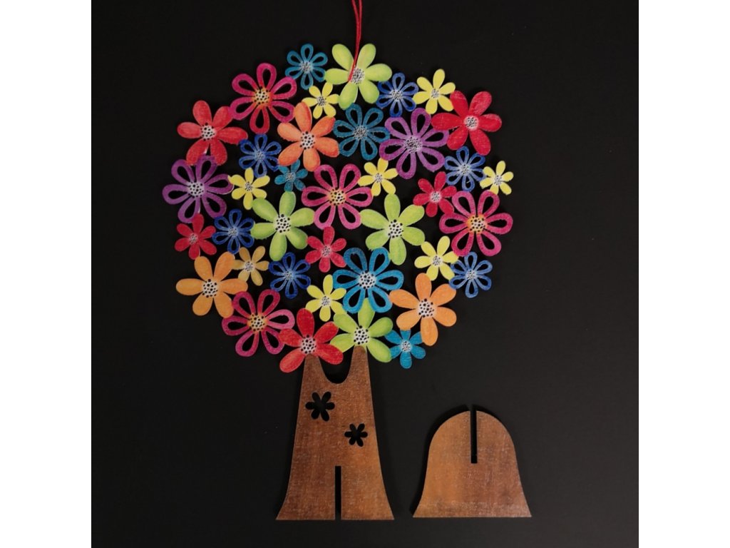 Dřevěná barevná dekorace 3D strom s květy stojící je vyrobená z překližky topolu a vybarvená. Strom se dodává zabalený spolu s podstavcem v celofánovém sáčku. Rozměr dekorace je 20 cm.