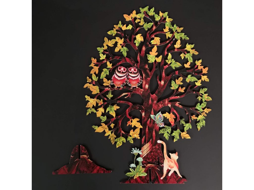 Dřevěný 3D strom se sovami, barevný, výška 28 cm