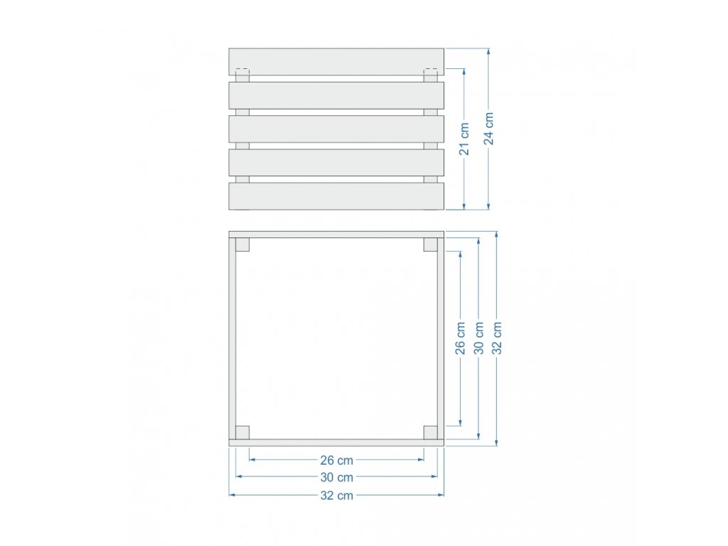 Dřevěný obal s květináčem je vyrobený z masivního smrkového dřeva bez povrchové úpravy. Vnější rozměr 32x32x24 cm. Vnitřní rozměr 26x26x24 cm. Součástí výrobku je samozavlažovací květináč o rozměrech 30x30x24, který dobře zapadne a drží v obalu. Český výrobek