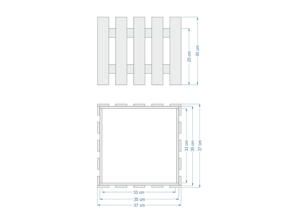 Dřevěný obal s květináčem je vyrobený z masivního smrkového dřeva a namořený. Vnější rozměr 37x37x30 cm. Vnitřní rozměr 33x33x30 cm. Součástí výrobku je samozavlažovací květináč o rozměrech 35x35x28, který dobře zapadne a drží v obalu. Není určené pro přímý styk s vodou. Český výrobek