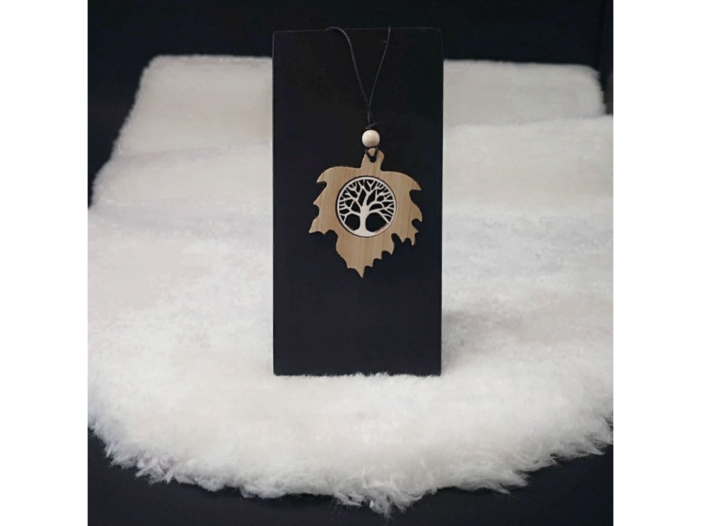 Dřevěný přívěsek ve tvaru javorového listu s vkladem stromu je vyrobený z masivního dubového dřeva a vklad je z překližky topolu, rozměr je 6 x 5 cm. Přívěsek je zavěšen na černé voskované šňůrce o délce 80 cm a zabalen je do dárkové krabičky.Doplňkové parametry
