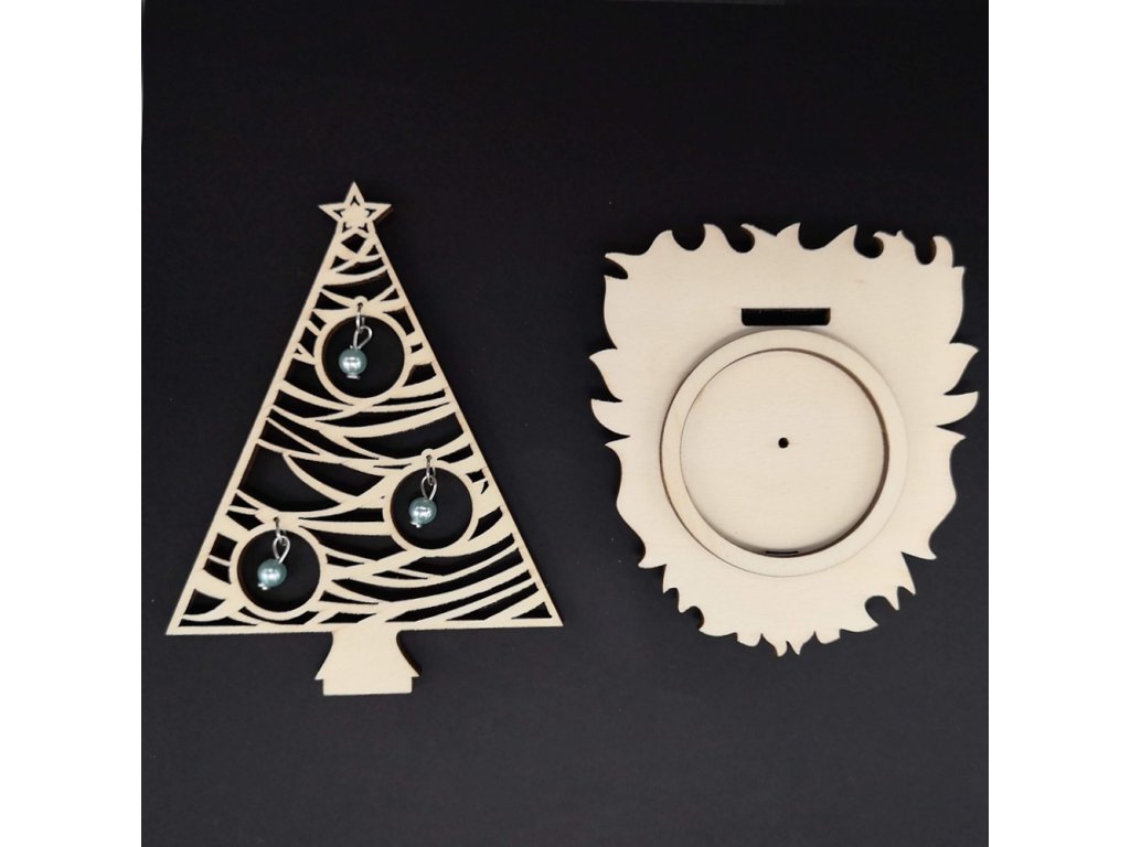 Dřevěný svícen stromek s ozdobami, 10 cm