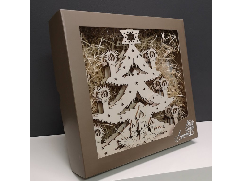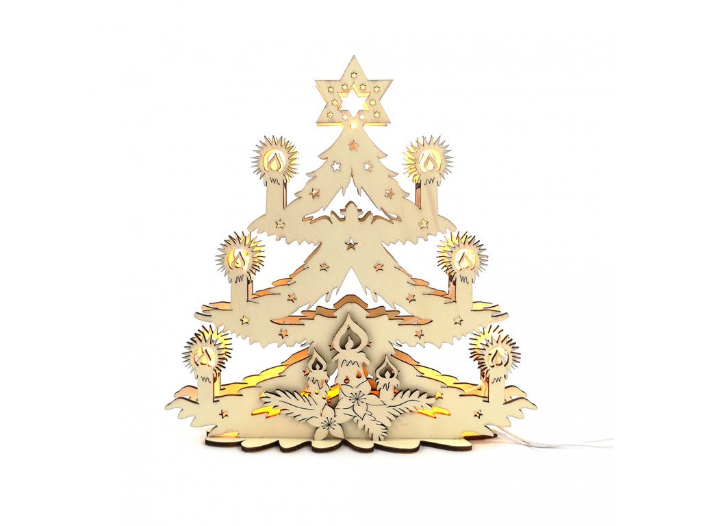 Dřevěná dekorace svítící portál s motivem vánočního stromu je vyrobená z topolové překližky.