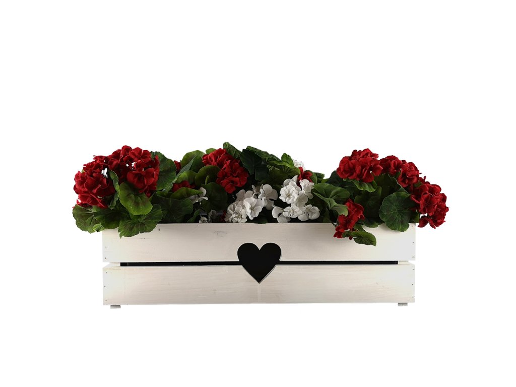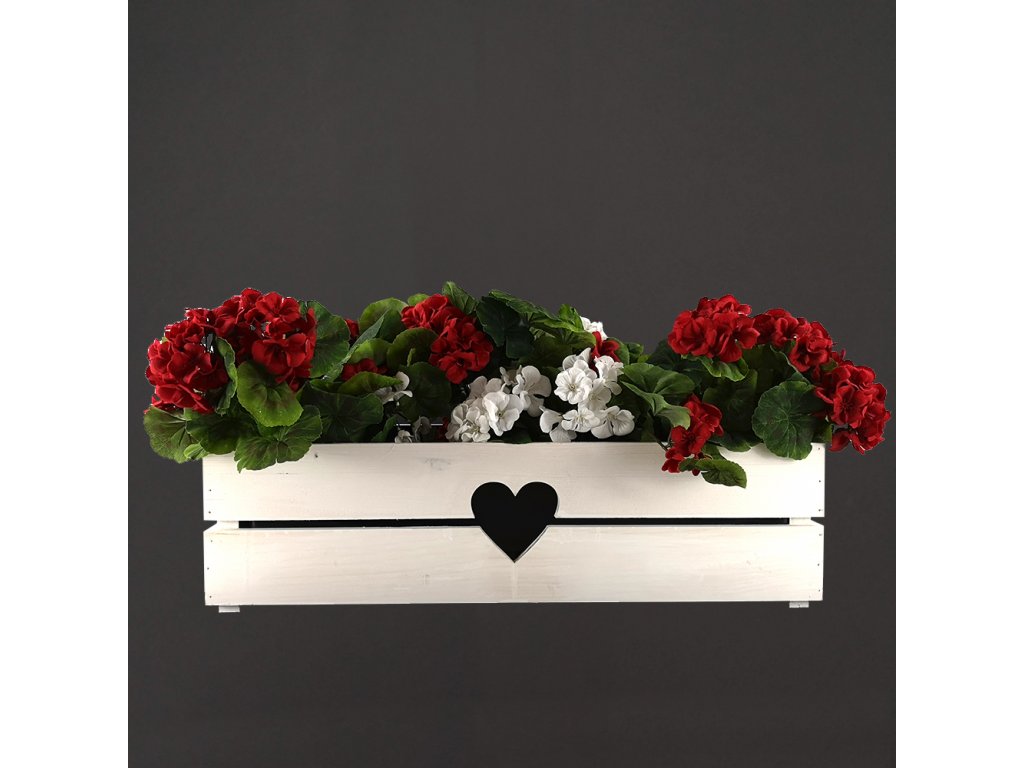 Dřevěný truhlík je vyrobený z masivního smrkového dřeva a natřený bílou barvou. Ve středu truhlíku je vyříznutý motiv srdíčka. Truhlík je ozdobou nejen do interiéru, ale využití nalezne i v zastřešeném exteriéru. Vnější rozměr 62x21,5x17cm. Vnitřní rozměr 60x19,5x16cm. Truhlík je uvnitř opatřen černou fólií o tloušťce 150 mikronů. Fólie je z hygienicky nezávadného koextrudovaného polyethylenu. Jedná se o 3-vrstvou vyfukovanou fólii LDPE, která je velmi pevná a nahrazuje tak běžně vkládáný plastový truhlík. Český výrobek