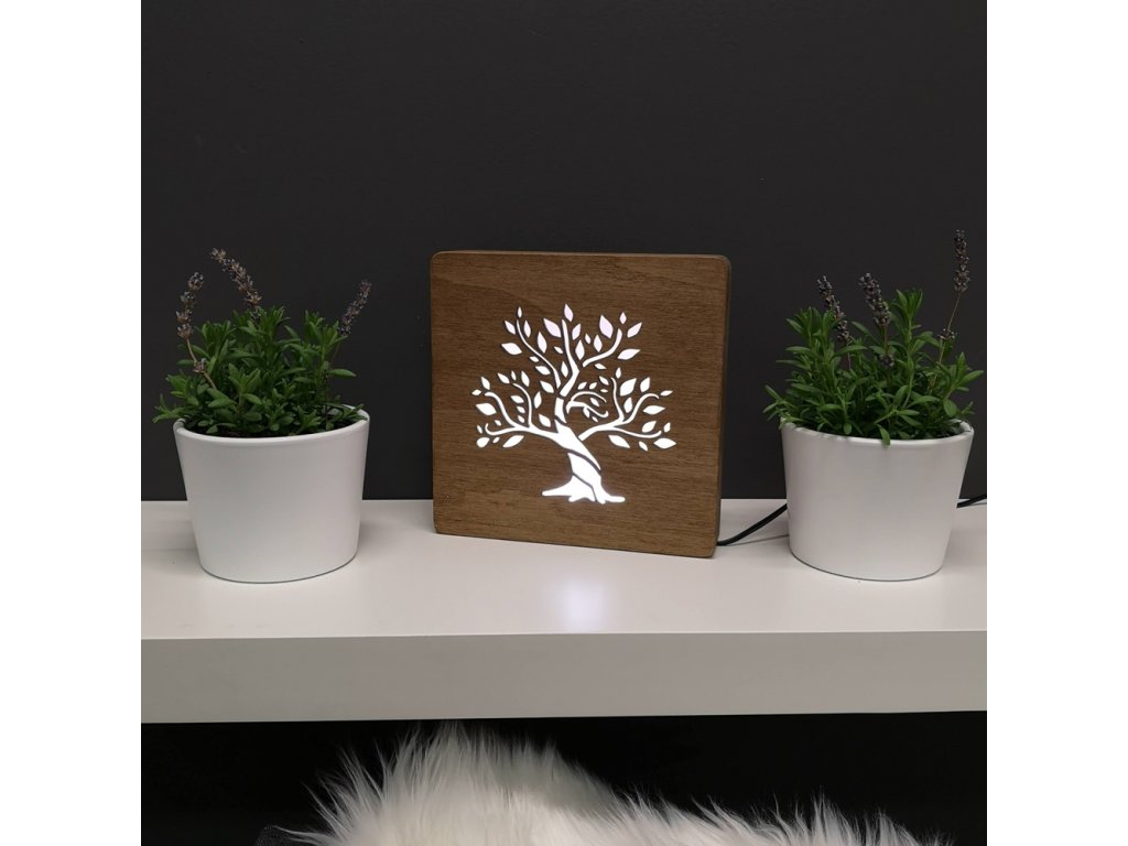 Wooden decorative lamp with tree motif is made of beech wood and finished with brown decorative wax. Dimensions 20 x 20 x 3,8 cm. The high quality LED lighting is powered by the included 12V power supply with a switch on the cable. The lamp is packed in a white gift box with a transparent lid.
