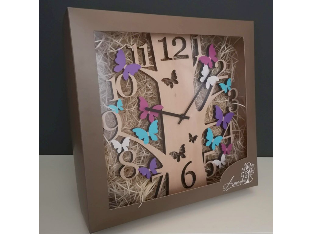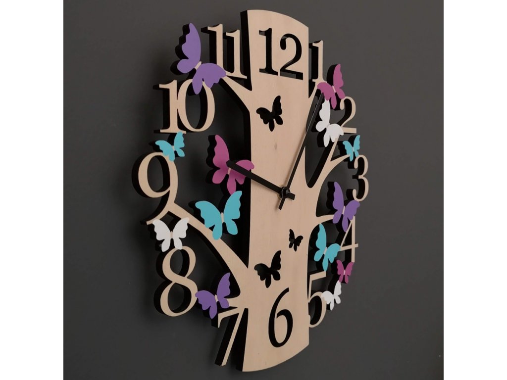 Wooden wall clock in the shape of a tree with colourful butterflies is made of beech plywood, the size is 30 x 29 cm, the clock is treated with wax on the surface. The clock comes packaged in a gift box with a transparent lid. The clock movement is QUARTZ brand made in Germany, has quiet operation, AA 1.5V battery. Czech product.