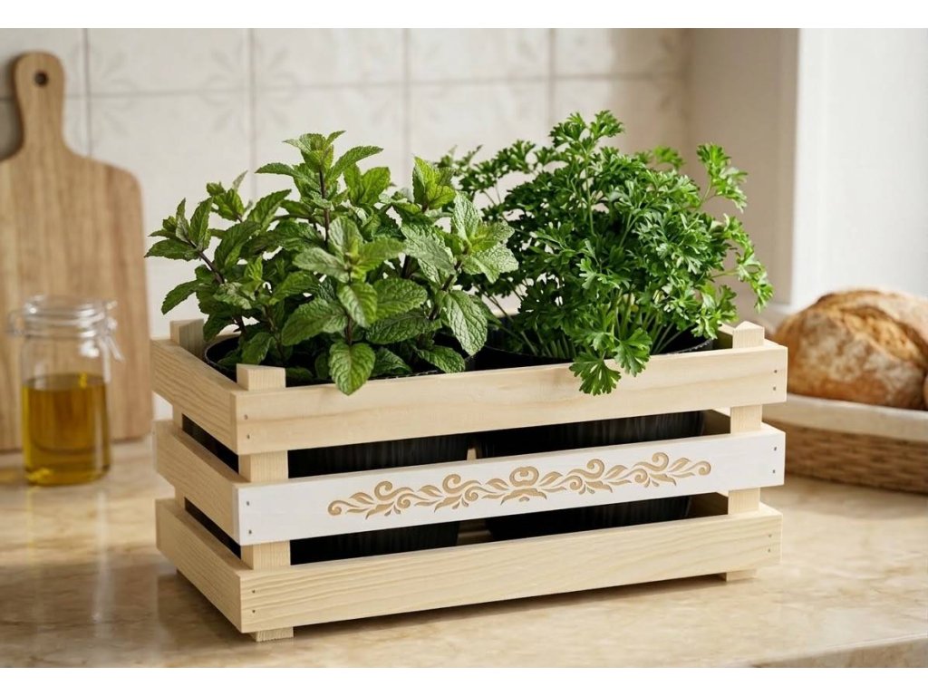 The wooden pot holder is made of solid spruce wood without finish. The middle partitions are painted white and decorated with a lace motif. Outer dimension 32x17x15cm. Inner dimension 30x15x15 cm. Suitable for two round pots with a diameter of 15cm, or for a rectangular box with a maximum size of 28x13 cm. Suitable pots can be found in our offer under the code 40657. The pot is not included. Product of the Czech Republic.