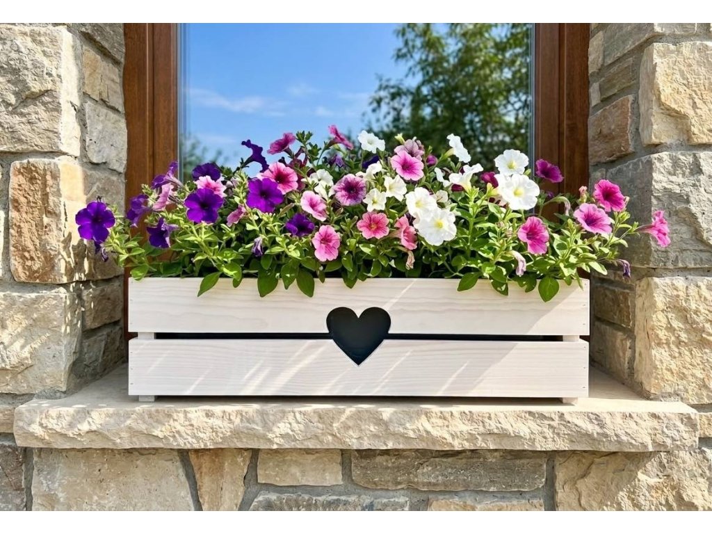 The wooden box cover is made of solid spruce wood and painted white. There is a heart cut out in the middle. Outer dimensions 60x21.5x17cm. Inner dimension 60x19,5x15cm. Suitable for a self-watering box measuring 60x19x16.5, which fits well and is held in its packaging on the inner wooden partition. You can find a suitable chest in our offer under the code 40669. The chest is not included. Product of the Czech Republic.