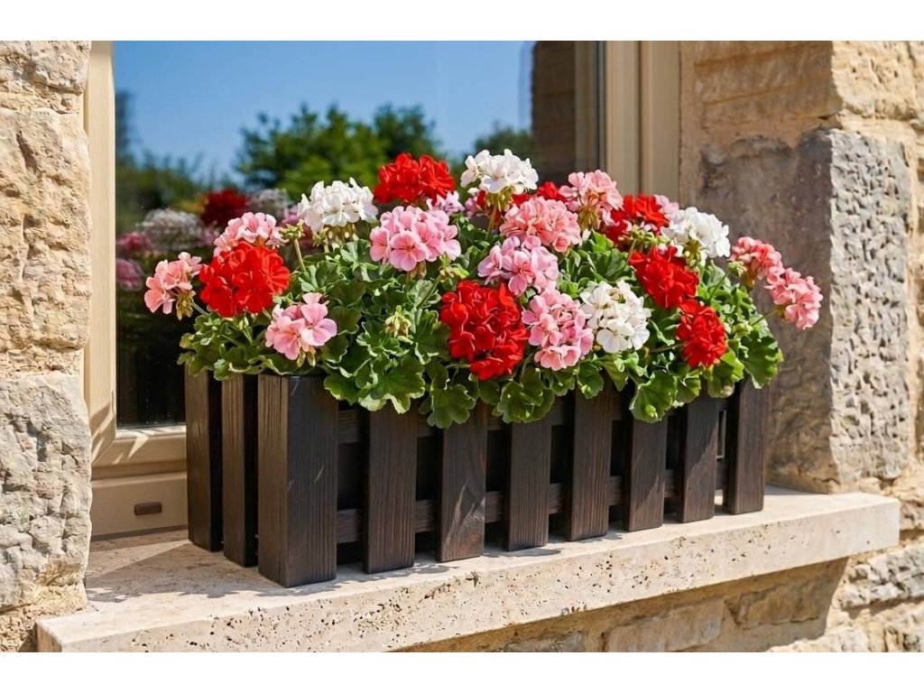 The wooden box cover is made of solid spruce wood and stained. Outside dimensions 62x21,5x18cm. Inside dimensions 58x17,5x18 cm. Suitable for a self-watering box measuring 60x19x16.5, which fits well and is held in its packaging on the inner wooden partition. You can find a suitable chest in our offer under the code 40669. The chest is not included. Not intended for direct contact with water. Product of the Czech Republic.