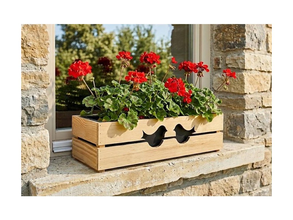 The wooden container with a chest is made of solid spruce wood without finish. There are birds cut out in the middle. Outer dimensions 60x21.5x17cm. Inner dimension 60x19,5x15cm. The product includes a self-irrigation box with dimensions 60x19x16,5, which fits and holds well in the packaging. The planter box is not only a decoration for the interior, but it also finds use in covered outdoor areas, it is not intended for direct contact with water. Product of the Czech Republic.