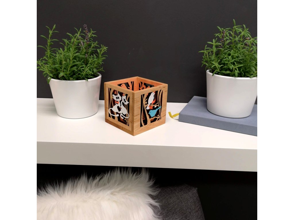 Wooden cube-shaped candle holder in colourful bird and cat motif is made of solid alder wood. Size is 10 x 10 cm. Inside the candlestick there is a hole and a glass cup for a tea light. The wood of the candlestick is treated with natural oil on the surface.Additional parameters