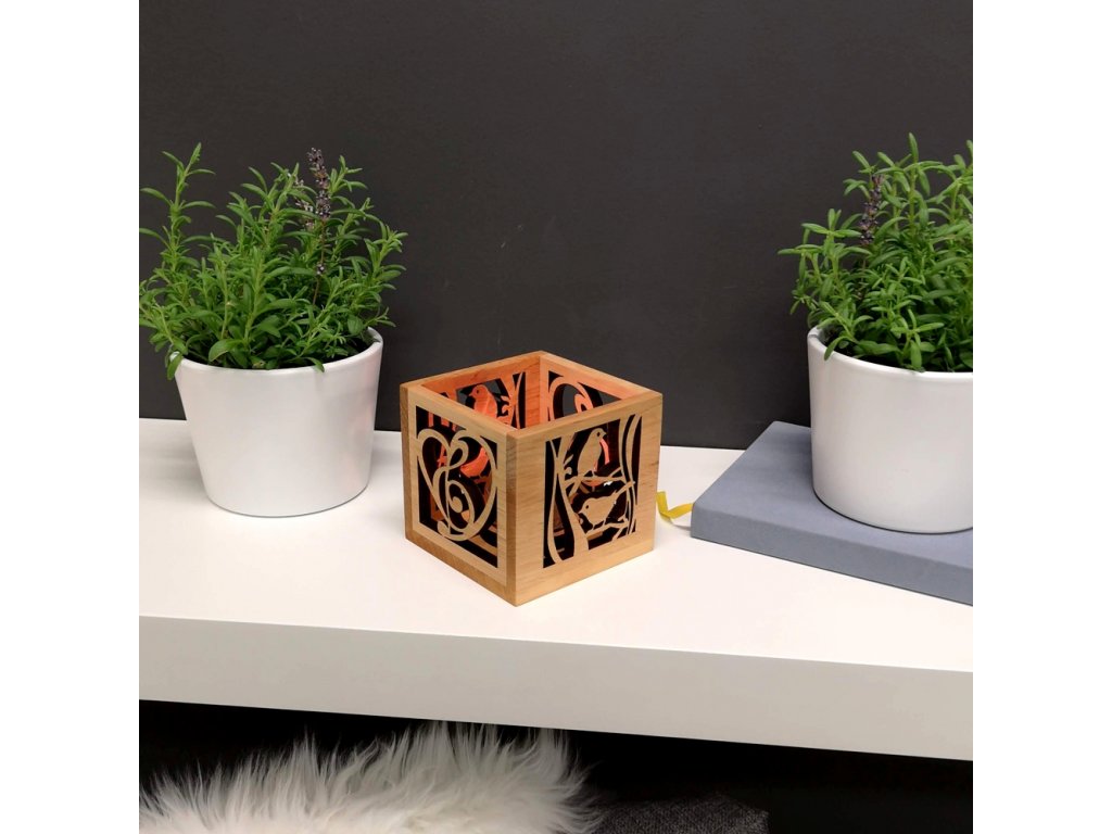 Wooden cube-shaped candle holder with a heart motif with a violin key and birds is made of solid alder wood. Size is 10 x 10 cm. Inside the candlestick there is a hole and a glass cup for a tea light. The wood of the candlestick is treated with natural oil on the surface.Additional parameters