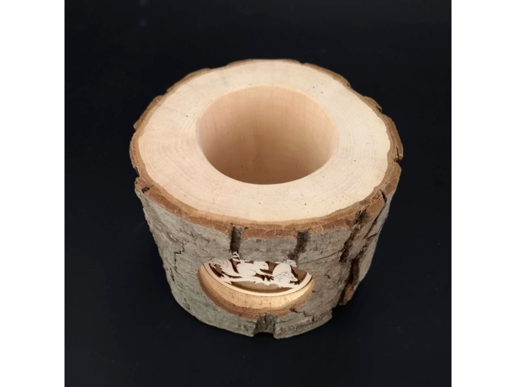 The wooden bark log candle holder with squirrel insert is carved from solid alder wood and the insert is made from poplar plywood. Inside the candlestick is a wooden tray for a tea light. This natural decoration has a dimension of 12 cm.Additional parameters