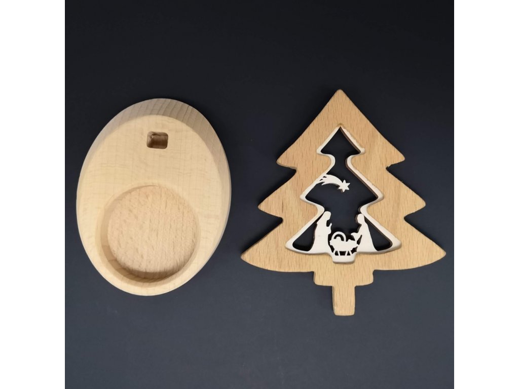 The wooden candle holder in the shape of a tree with a crib motif is made of solid beech wood and the insert is made of poplar plywood. The candle holder includes a glass cup for a tea light placed in the base. The size of the decoration is 10 x 7,50 x 1,50 cm. The wood is treated with natural oil on the surface.Additional parameters