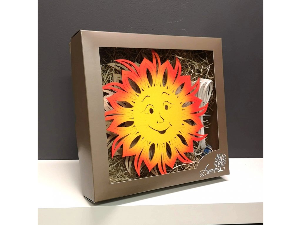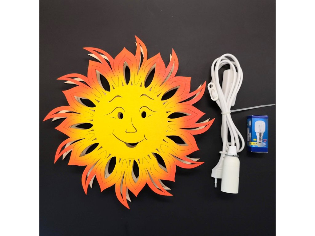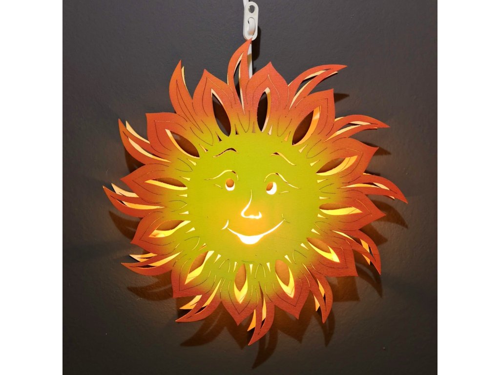 Dřevěná dekorace barevná lampa s motivem slunce je určená k dekorativnímu prosvětlení interiéru. Vyrobená je z topolové překližky a rozměr má 28 cm. Součástí lampy je přívodní kabel s vypínačem a žárovka 230 V 15 W E14. Lampa je zabalena do dárkové krabice s průhledným víkem.