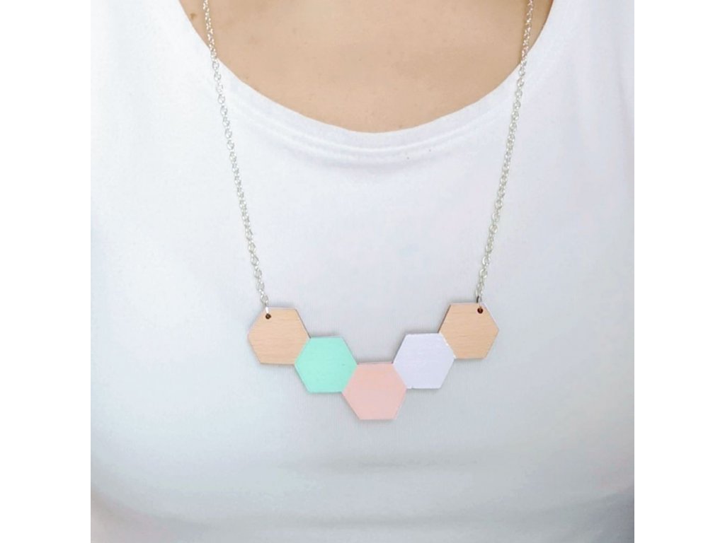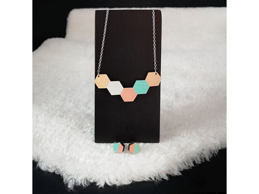 Sada originálního dřevěného náhrdelníku s náušnicemi je vyrobená z masivního bukového dřeva a barevně potištěná. Rozměr náhrdelníku je 8 cm, řetízek je mosazný s délkou 64 cm. Rozměr náušnic je 1,3 cm a zapínání je z chirurgické oceli. Šperky jsou díky své lehkosti velmi příjemné při nošení a hodí se k mnoha příležitostem. Šperky jsou zabaleny v dárkové krabičce.Doplňkové parametry