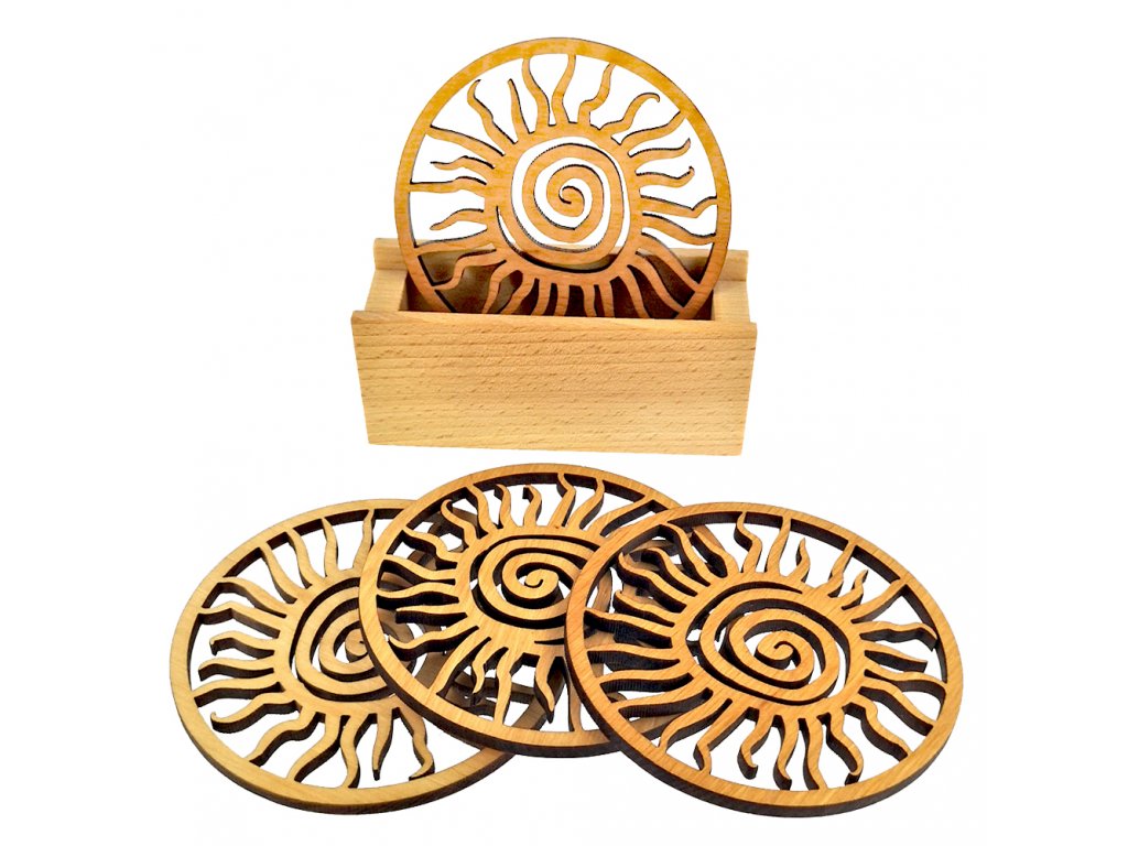 Sada pro stolování - stojánek na podtácky a čtyři podtácky stejný motiv z masivního dřeva