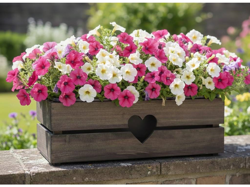 Drevený kontajner s krabicou je vyrobený z masívneho smrekového dreva a je morený. V strede je vyrezané srdce. Vonkajšie rozmery 52x21,5x17cm. Vnútorný rozmer 50x19,5x15cm. Súčasťou výrobku je samozavlažovací box s rozmermi 50x19x16,5, ktorý sa dobre zmestí do obalu a dobre sa v ňom drží. Nie je určený na priamy kontakt s vodou. Český výrobok.