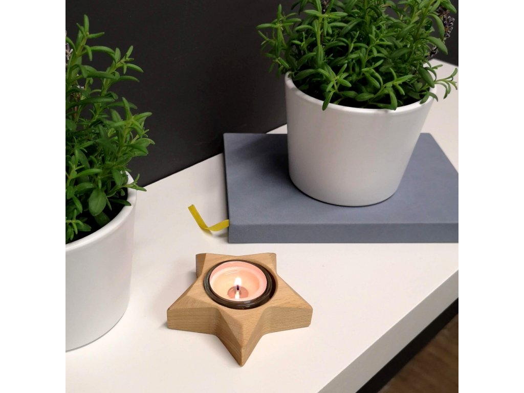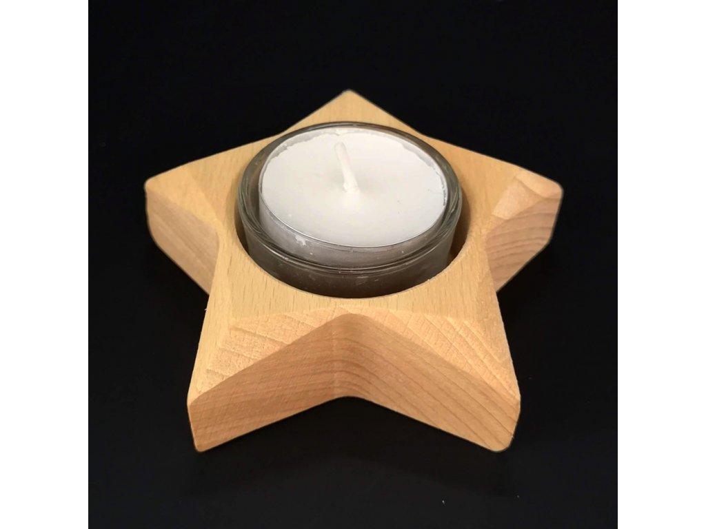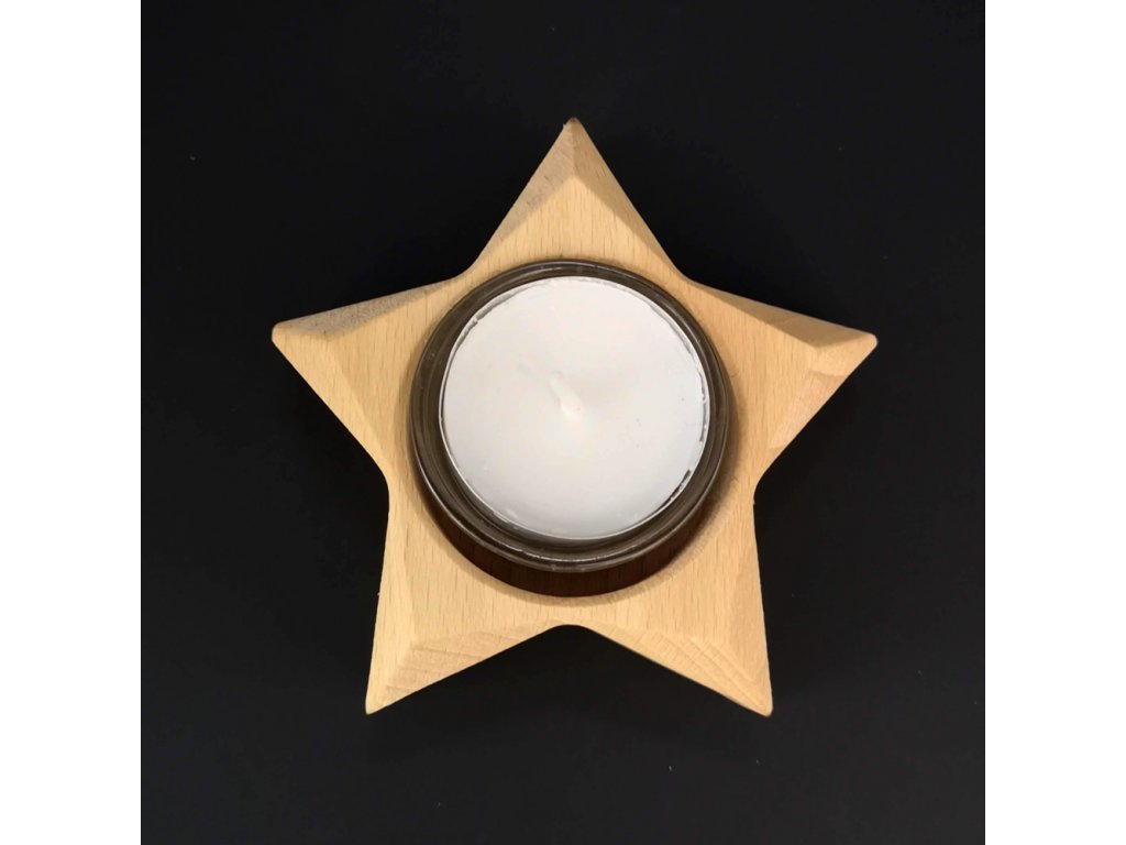 Drevený svietnik v tvare hviezdy je vyrobený z masívneho bukového dreva. Vo vnútri svietnika sa nachádza sklenený pohár na čajovú sviečku. Rozmery sú 10 x 10 x 3 cm. Drevo je na povrchu ošetrené prírodným olejom.Dodatočné parametre